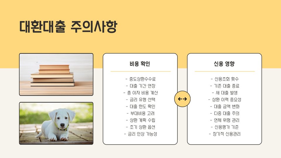 하지만 단점도 존재합니다. 대환대출이 항상 유리한 것은 아니라는 점입니다. 대출 상품에 따라 수수료가 발생할 수 있으며, 대환대출이 오히려 더 높은 금리를 부과하는 경우도 있으니 주의해야 합니다. 따라서, 대환대출을 결정하기 전에는 충분한 정보 수집과 분석이 필요합니다. 이를 통해 자신에게 가장 적합한 금융 솔루션을 찾을 수 있습니다.