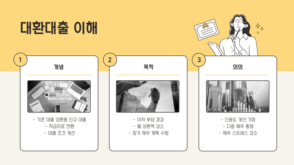 - 대환대출은 기존 대출의 이자를 줄이는 데 도움을 준다.