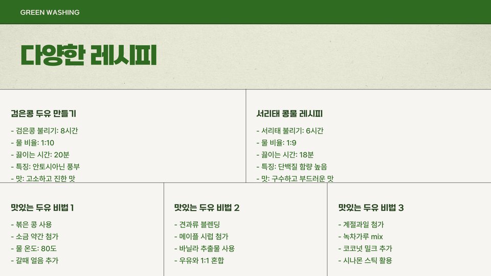 - 두유는 음료 외에도 다양한 요리에 활용할 수 있습니다.