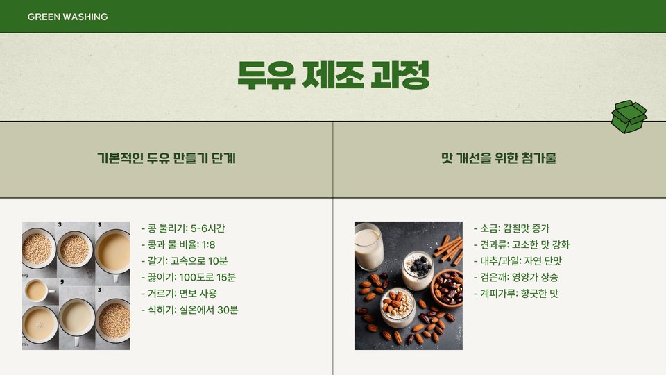 - 기본 재료로는 콩과 물이 필요하며, 다양한 첨가물로 맛을 조절할 수 있습니다.