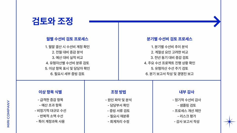 수선비, 계정과목, 재무 관리, 예방 유지 보수, 예산 수립, 데이터 분석, 직원 교육, 비용 절감, 신뢰할 수 있는 업체, 성과 평가