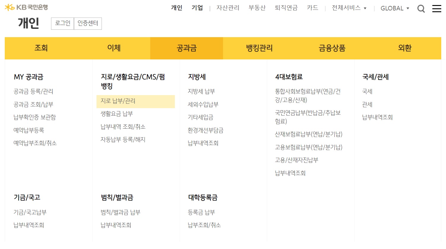국민은행 인터넷뱅킹 접속 후 공과금 탭에 생활요금 납부 클릭하여 신청합니다.