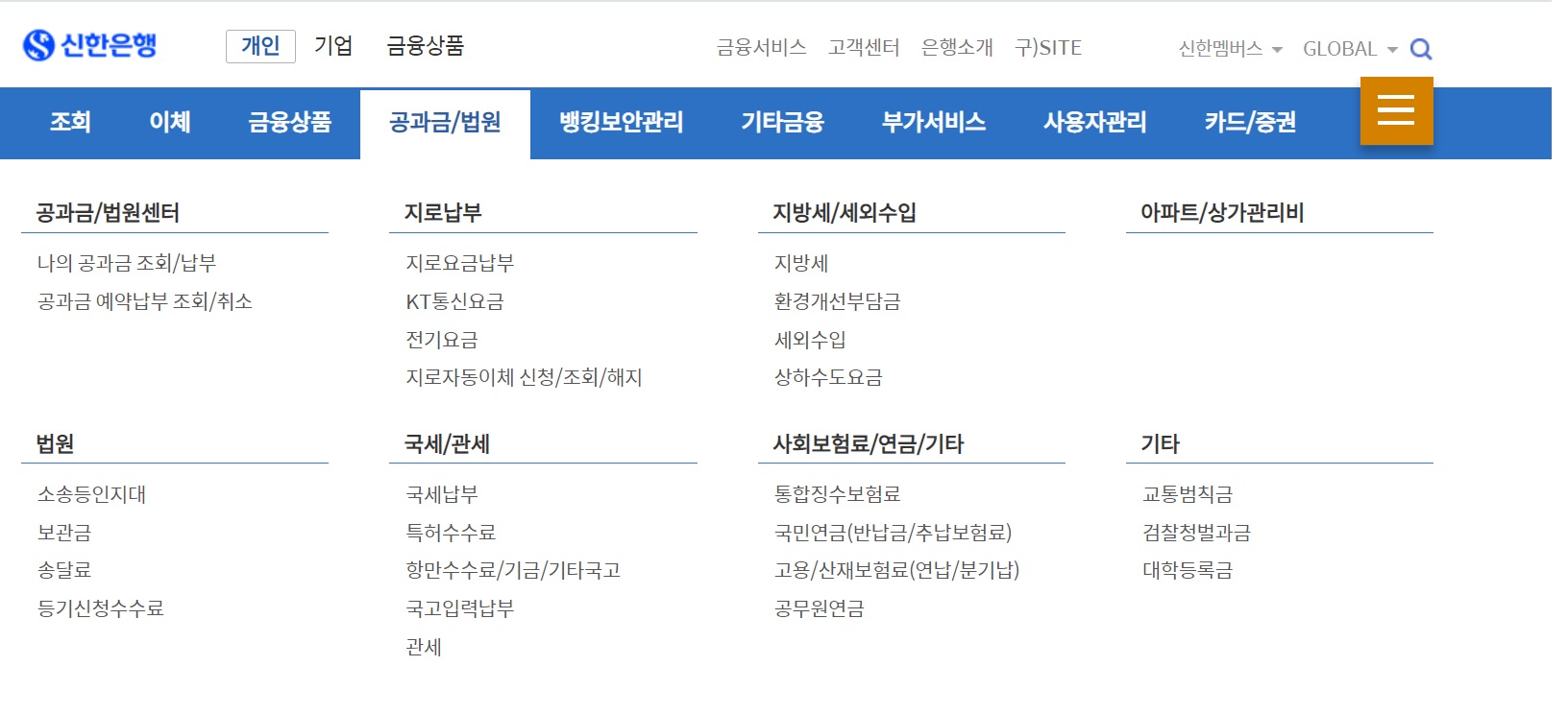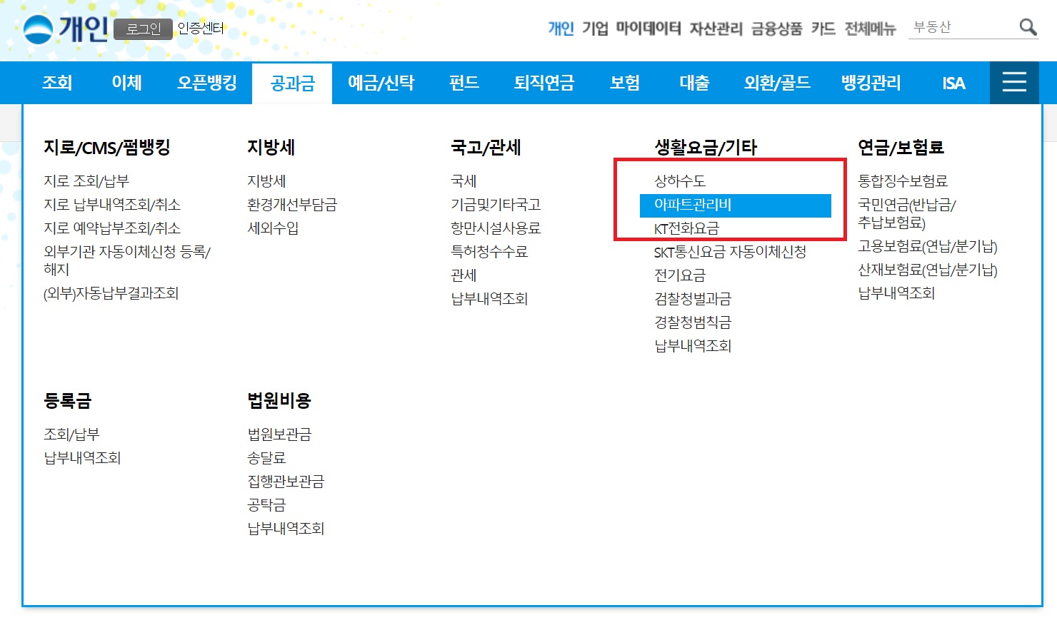 신한은행 인터넷뱅킹 접속 후 공과금/법원 탭에서 아파트/상가관리비를 선택합니다.