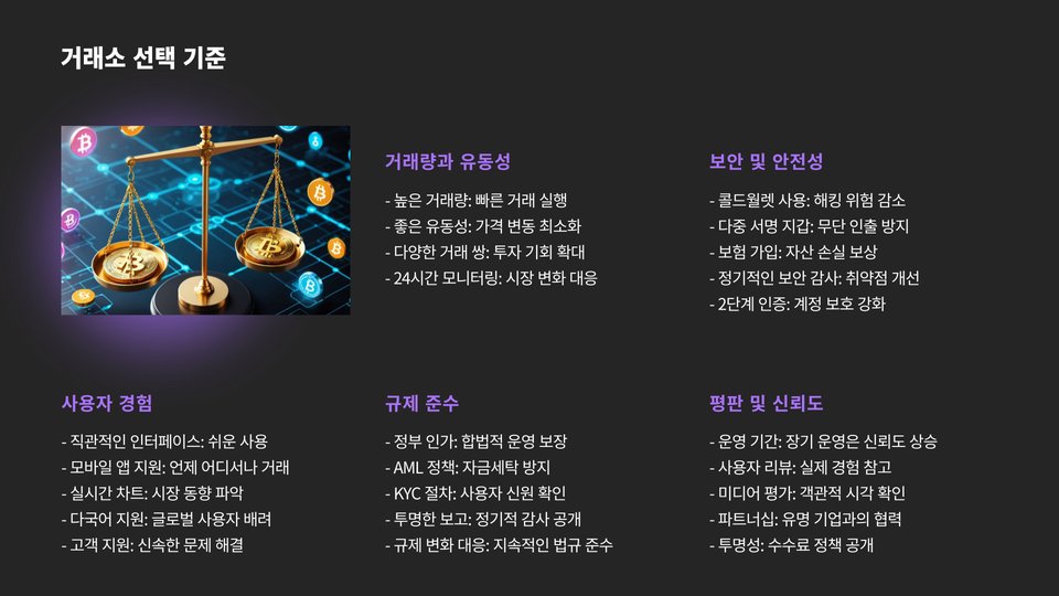 중요 팁: 거래소 선택 시 수수료, 보안, 사용자 리뷰를 종합적으로 고려하세요!