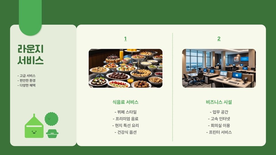 이 외에도 많은 라운지가 마사지 서비스, 비즈니스 회의실, 다양한 잡지나 신문을 제공하여 승객들이 더욱 편안하고 유익한 시간을 보낼 수 있도록 돕습니다. 가끔 혼잡할 수 있으니, 사전에 예약하는 것이 좋습니다. 특히, 성수기에는 많은 승객들이 라운지를 이용하므로, 예약 없이 방문할 경우 원하는 서비스를 이용하기 어려울 수 있습니다.