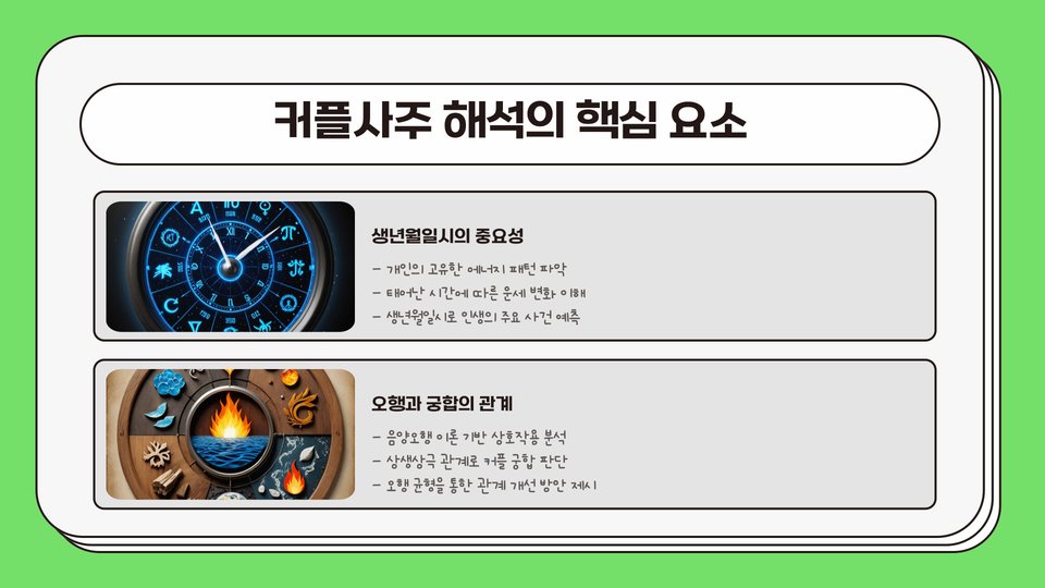 사주를 통해 커플 궁합을 분석하는 방법은 여러 가지가 있습니다. 일반적으로는 두 사람의 출생 정보를 바탕으로 각각의 사주를 비교합니다. 이를 통해 두 사람의 오행(목, 화, 토, 금, 수)과 생년월일, 시간을 분석하여 서로의 성향을 파악합니다.