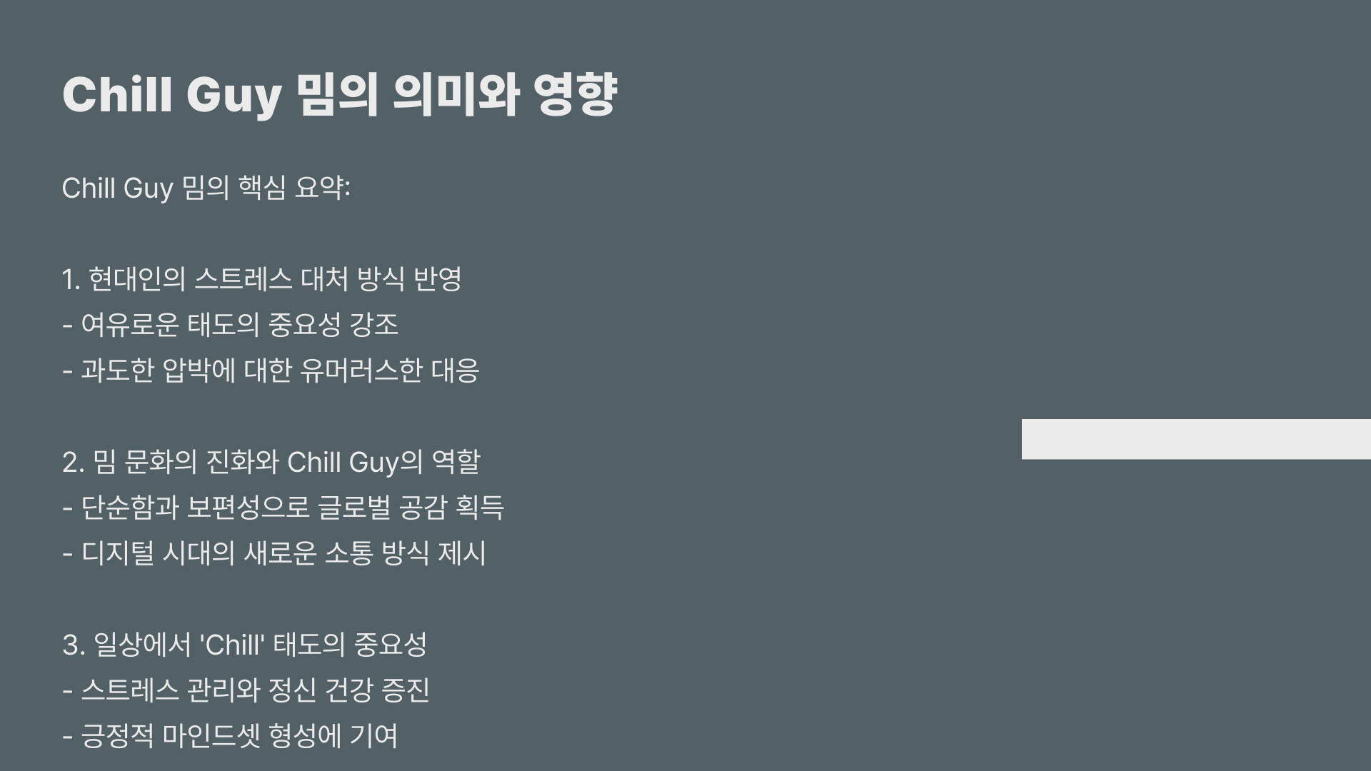 이 밈은 단순한 웃음거리를 넘어서, 현대 사회에서의 스트레스와 불안감을 해소하는 데 도움을 줍니다. 사람들은 chill guy를 통해 자신의 감정을 표현하고, 스트레스를 줄이는 방법을 배우게 됩니다. 또한, 이 밈은 사람들 간의 소통을 촉진시키고, 서로를 위로하는 데 기여합니다. 결국, chill guy는 긍정적인 변화의 상징이자, 삶의 여유를 찾는 데 중요한 역할을 합니다.