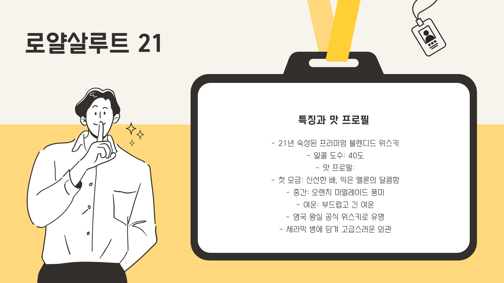 마지막으로, 로얄살루트 21은 특별한 이벤트나 기념일에 잘 어울리는 제품입니다. 고급스러운 패키징과 맛 덕분에 사람들에게 큰 감동을 주는 선물이 될 수 있습니다. 따라서 면세점에서의 구입은 실속 있는 소비가 될 것입니다.