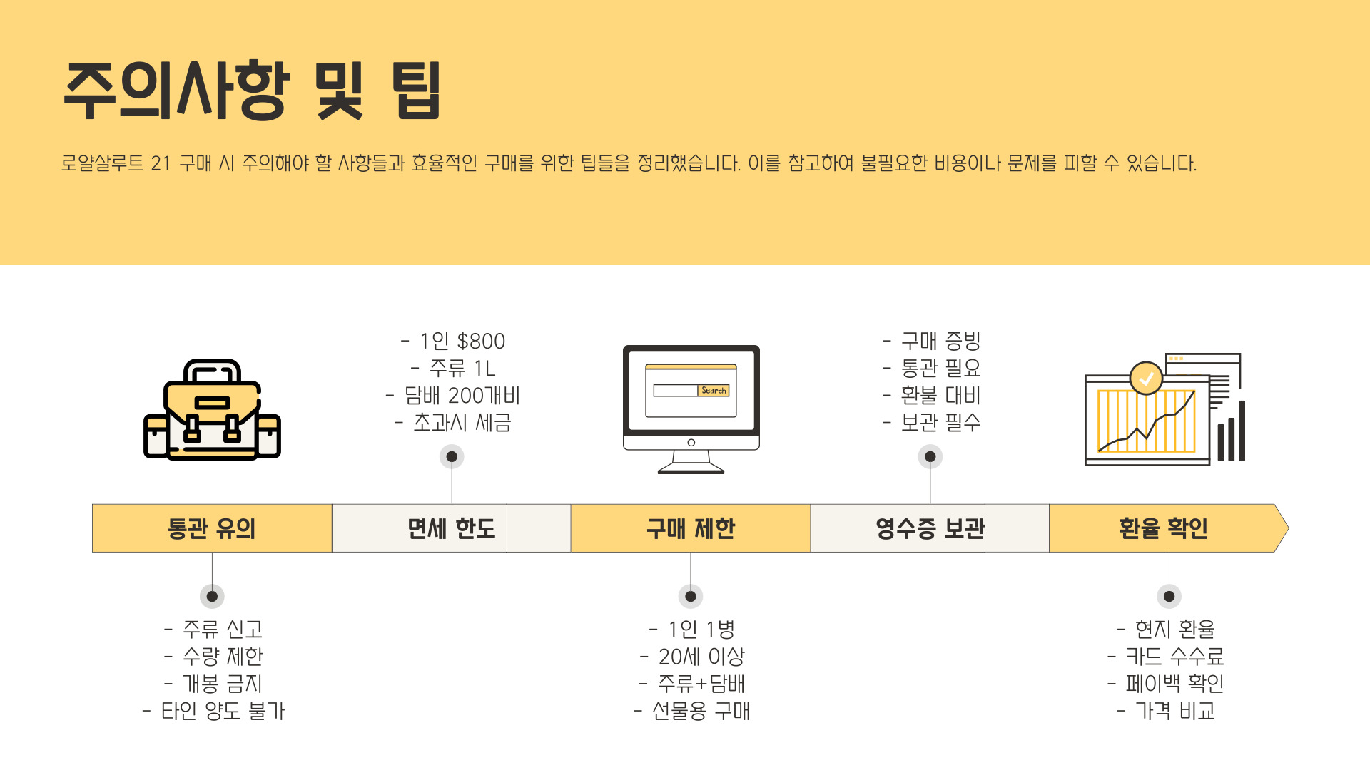 면세점에서 로얄살루트 21을 구매할 때는 몇 가지 주의할 점이 있습니다. 먼저, 면세 한도를 확인해야 합니다. 국가별로 면세 한도가 다르므로, 이를 초과할 경우 세금을 납부해야 할 수 있습니다. 또한, 면세점에서 구매한 제품은 공항을 출발할 때만 사용할 수 있으므로 귀국 후에는 사용할 수 없습니다. 구매 전 이러한 조건을 충분히 이해하고 결정하는 것이 중요합니다.